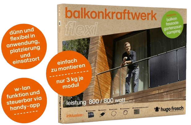 hugo frosch solar bietet hochwertige Lösungen rund um Balkonkraftwerke. Flexibele Panele, Modulare Speicher, Kabel und Halterungen.